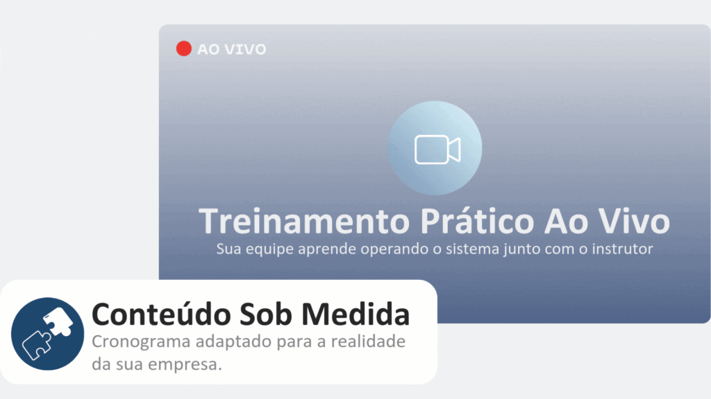 Aprenda diretamente com especialistas via videochamada. Um curso prático e 100% personalizado para a realidade da sua empresa, ensinando sua equipe a operar o sistema e resolver as dúvidas do dia a dia.
